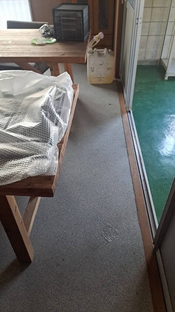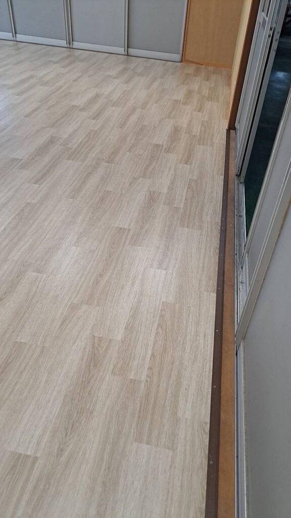 ドア付近にへの字(見切り材)を設置し、段差が出ないよう調整いたしました。