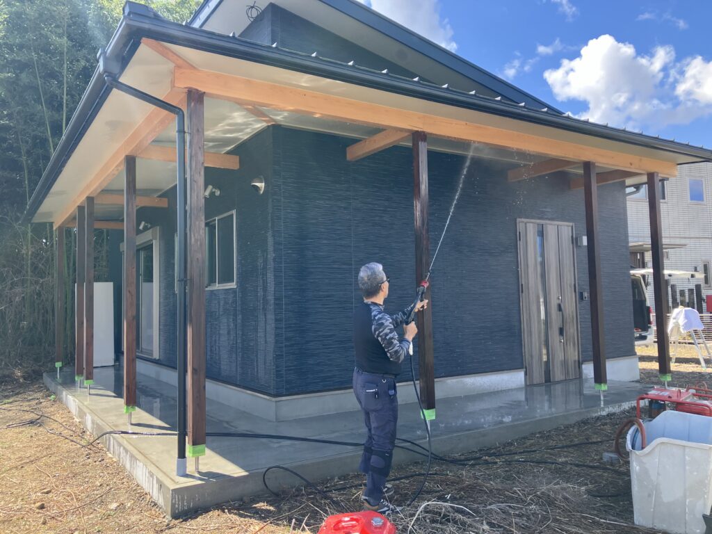 高圧洗浄でクモの巣や汚れを一気に落としていきます。